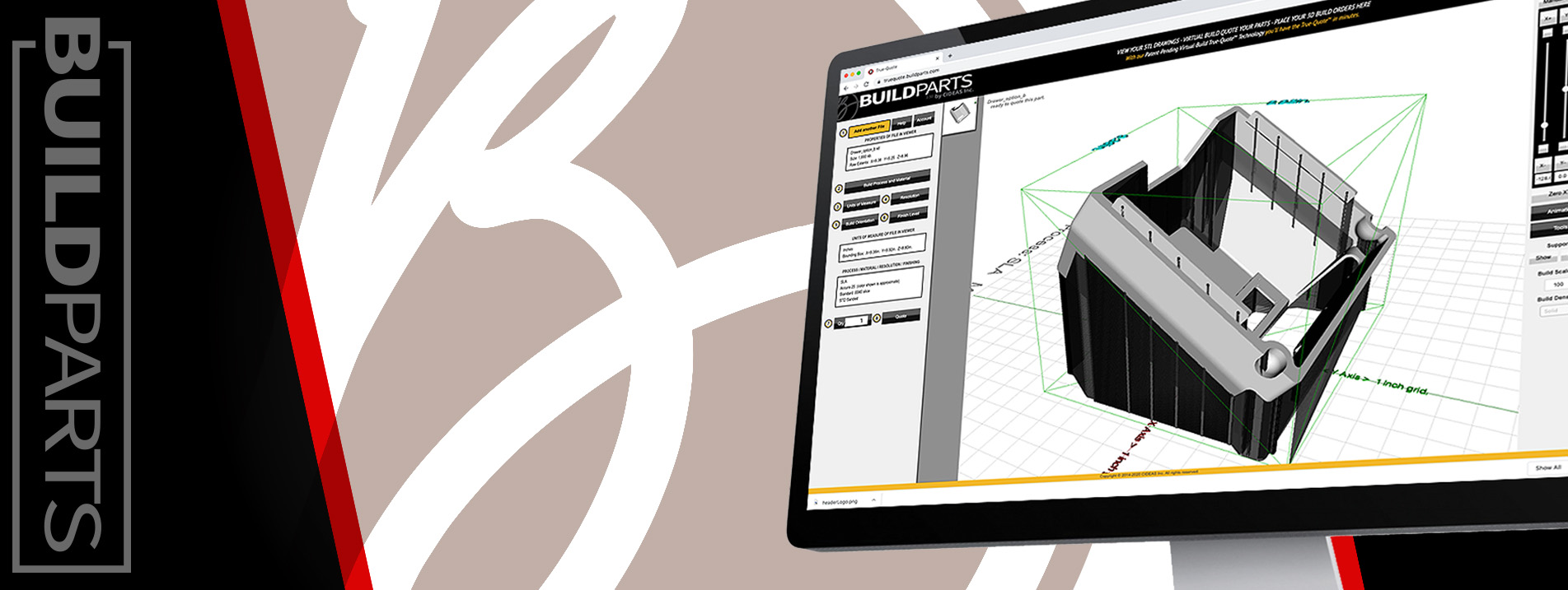 BuildParts’ True-Quote is an advanced quoting system created by an internal team within CIDEAS Inc. which enables YOU to control your prefered part orientation as well as: Multiple process selection, scaling, fill density (FDM only), build layer height and finish level. Aside from an accurate quote, True-Quote enables you to: Visualize your part, check units of measure, basic dimensions, wall thicknesses and determine if small features are printable.